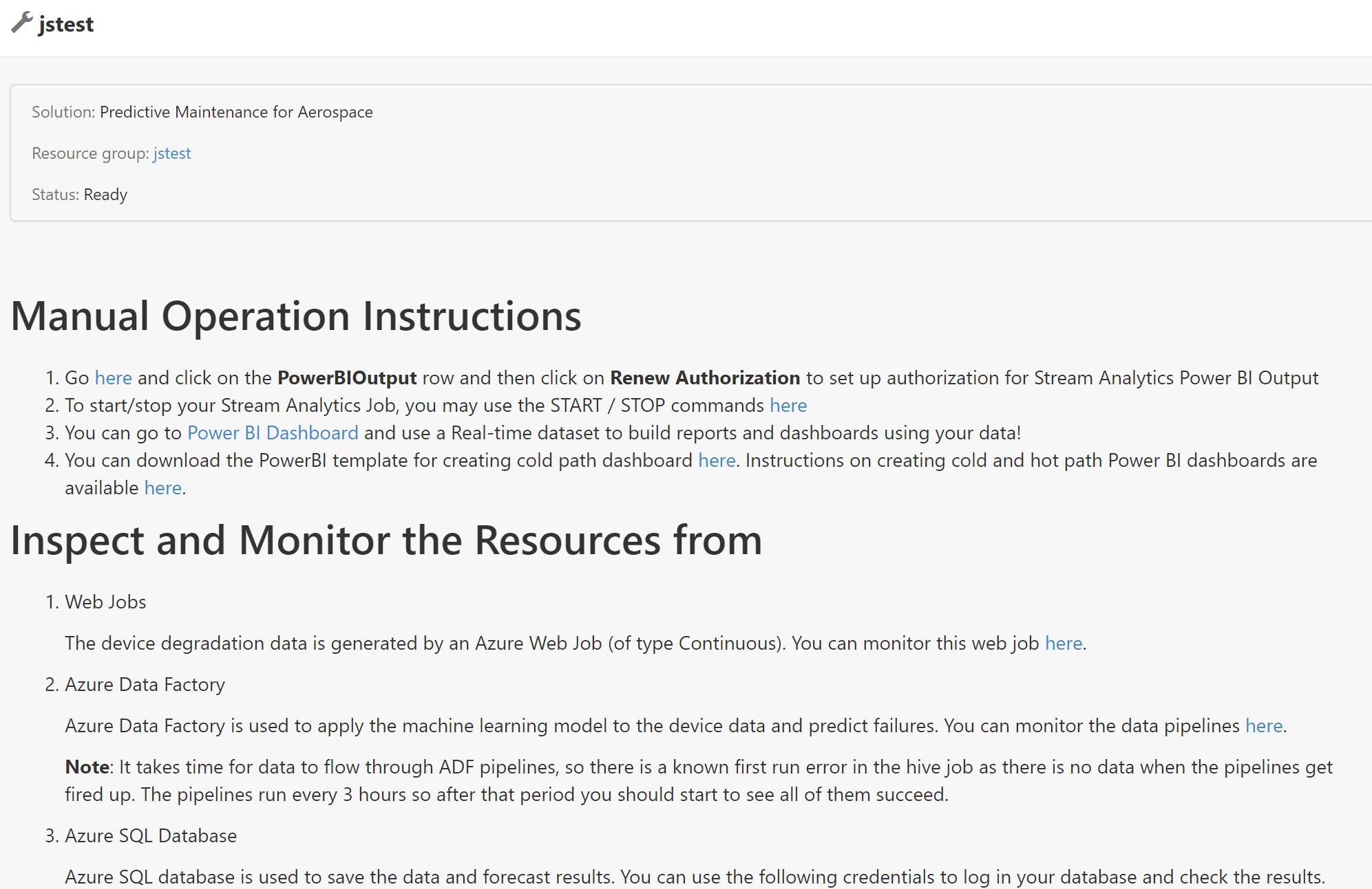 You can always view the post-deployment instructions later by clicking “Deployments” on the main page of the Cortana Intelligence Solution and clicking on the deployment name.